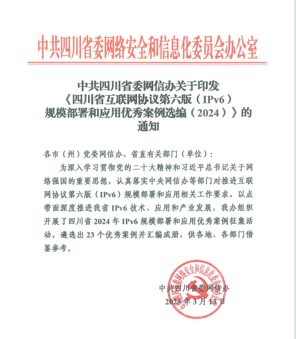 近日,四川省委网络安全和信息化委员会办公室正式发布了《四川省互联网协议第六版(IPv6)规模部署和应用典型案例选编(2024)》。学校报送的《全域IPv6单栈的演进和创新之路》在众多申报案例中脱颖而出,位列23个优秀案例之列。学校认真贯彻落实国家关于加快推进IPv6规模部署和应用工作要求,把IPv6规模部署作为信息化建设的重点工作,统筹规划、科学组织,以IPv6技术升级为基础,典型创新应用为抓手,实现IPv6规模部署为目的,...