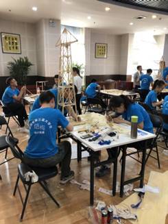 (比赛现场参赛队员紧张有序的制作模型)