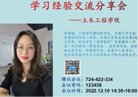 为帮助2022级新生进一步强化专业认知,规划大学生活,树立正确的学习观与就业观,12月10日下午,我院优秀校友学习经验交流会通过腾讯会议举行,校友崔媚媚应邀与新生分享了学习心得和职业规划,会议由李小伟老师主持。