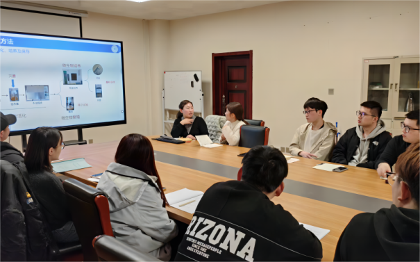 会上,刘伽博士首先对研究背景进行了介绍,在沙漠地区恶劣环境下,广泛分布的风积沙常用作路基填料。随着交通运输能力的提高,常常诱发路基沉陷、路基液化及路堑沙埋等危害,对交通的安全运营产生严重影响。然后以沙漠风积沙为研究对象,结合产脲酶微生物胶结与玄武岩纤维加筋技术,通过单元试验、模型试验及细微观试验,从宏观、细观及微观角度将固化风积沙力学特性与作用机理的研究成果与同学们进行了分享。同学们对交叉学科的研究展现了浓厚的学习兴趣,会上踊跃提问交流,刘伽博士针对同学们存在的疑惑给予了详细的解答。