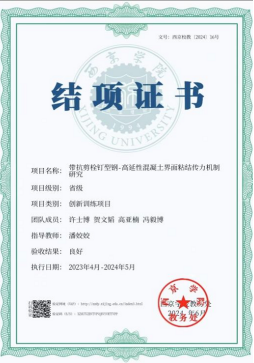 许士博注重学以致用,善于将力学原理、结构设计理论转化为解决实际工程问题的能力。他参与地基处理、装配式构件安装等现场实践,深化对绿色建筑材料与施工技术的理解。他积极投身于创新训练项目《带抗剪栓钉型钢-高延性混凝土界面粘结传力机制研究》,在学院导师的指导下及与同学们的共同努力下,该项目成功获得了省级立项。
