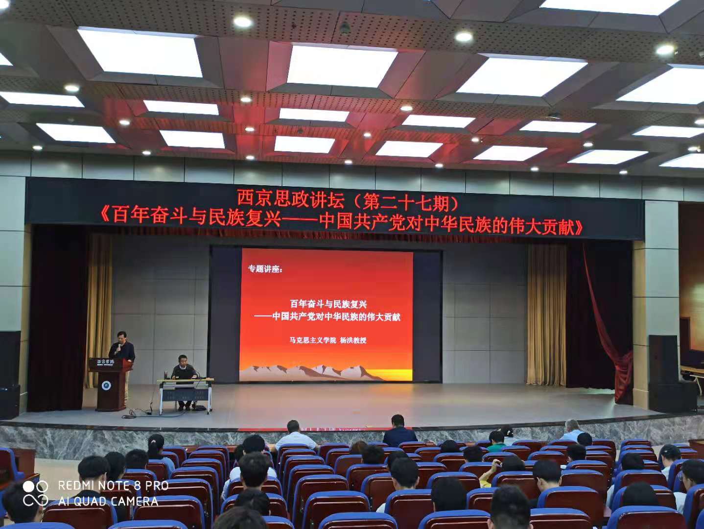 5月27日下午,西京思政讲坛第二十七期报告会在taptap官网小礼堂举办,马克思主义学院院长杨洪教授作了题为《百年奋斗与民族复兴――中国共产党对中华民族的伟大贡献》的专题报告。报告会由马克思主义学院王琪副教授主持,马克思主义学院教师、学校辅导员代表、至诚书院全体学生参加了报告会。