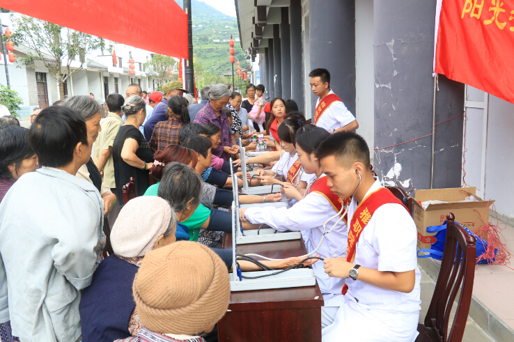 7月16日,志愿服务总队和药检系“阳光志愿”志愿服务队从学校出发经过两个多小时的车程到达石棉县安顺场古镇,开展了一系列志愿服务活动。首先开展的是“传递爱心,远送义诊”医疗卫生志愿服务。一大早,村民们就从四面八方赶来等候,把义诊台和咨询台围了个严严实实。药检系党支部书记杨泽刚、李飞老师带领志愿者们热情接待前来就诊的村民,仔细地为他们测量血糖血压、简单疾病诊断,宣传艾滋病预防和流行性疾病防治、普及基本医疗卫生知识。