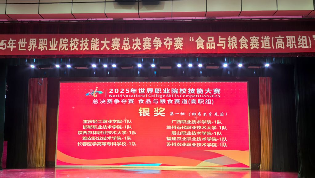 8月22日至26日,2025年世界职业院校技能大赛总决赛争夺赛“食品与粮食赛道(高职组)”在安徽芜湖职业技术大学隆重举行。本次赛事以“技炫青春,能创未来”为主题,来自全国31个省、市、自治区的94所高职院校、100支代表队、近800名师生同台竞技,竞争激烈。由学校药学与检验学院副院长何靖柳领队,刘翔、杨青青等专业教师指导,食品检验检测技术专业学生邱怡婕、马涵玲、丁香、陈诗琪组成的参赛团队,凭借扎实的专业功底、精湛的技术技能和出色的团队协作荣获银奖。