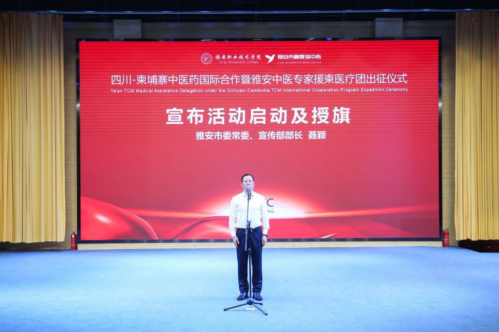 仪式在《四川—柬埔寨中医药国际合作项目》出征专题片的播放中拉开帷幕。在热烈的掌声中,聂颖宣布活动正式启动,并为出征医疗队授旗。