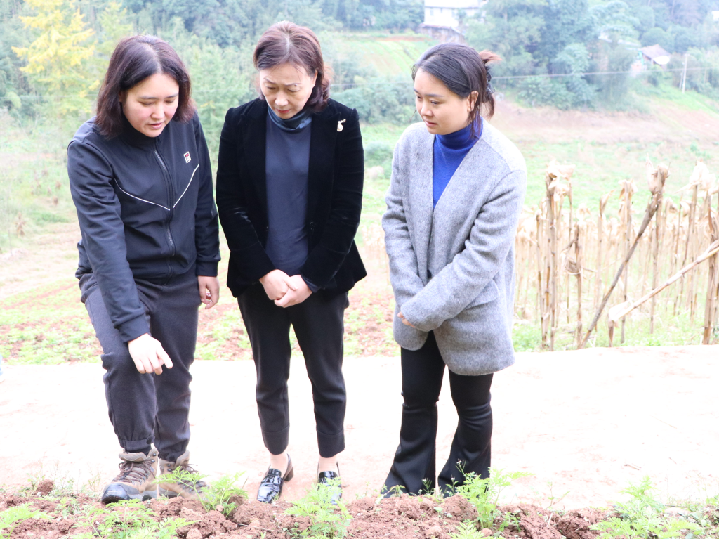 随后,杨洪媛一行深入田间地头调研共和村川芎中草药项目种植情况。雅药工作室专业教师牟兰博士查看川芎的长势,向种植户及村干部就种植技术、田间管理、病虫害防治及市场前景等提供了专业指导和建议。