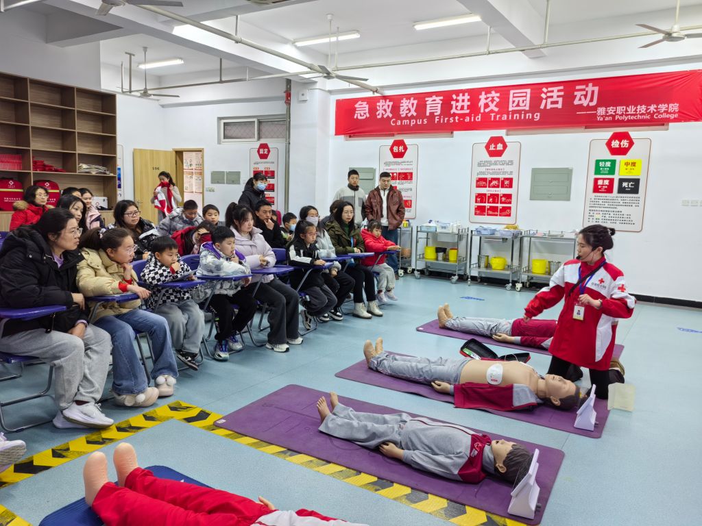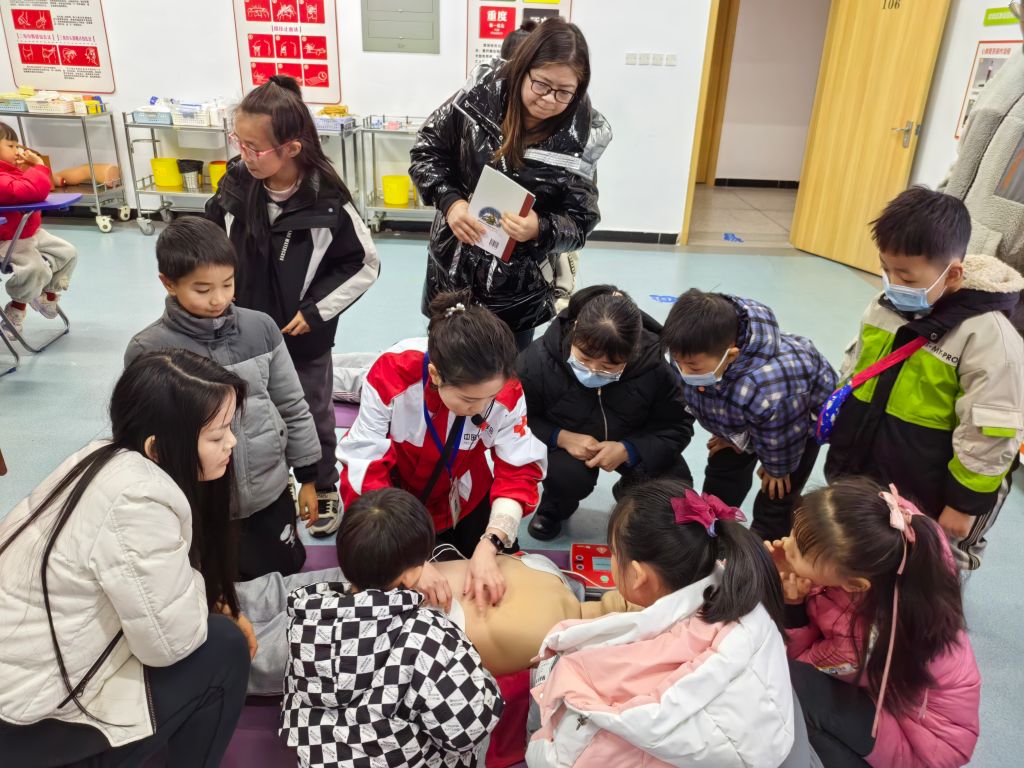 教师喻荣雪和李佳在科普基地的急救技能培训中心对亲子家庭进行意外伤害和急救技能培训,示范了心肺复苏和海姆立克急救法,基本外科护理包扎等救护操作,对体验学员进行现场操作指导。