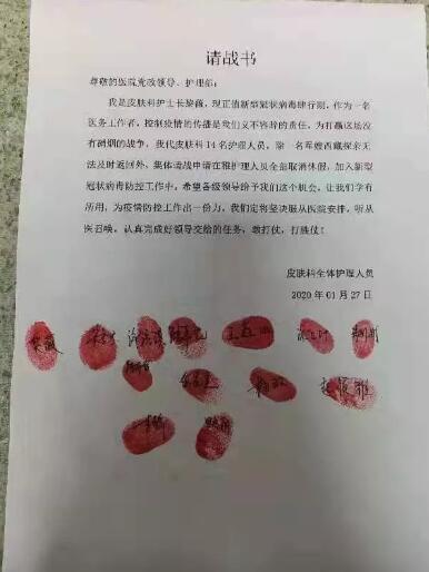 “皮肤科全体护理人员集体请战加入新型冠状病毒防控工作中......”