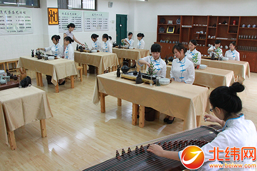 酒店管理专业老师正在向同学示范餐具摆放要领 旅经系学生正在上茶艺实训课